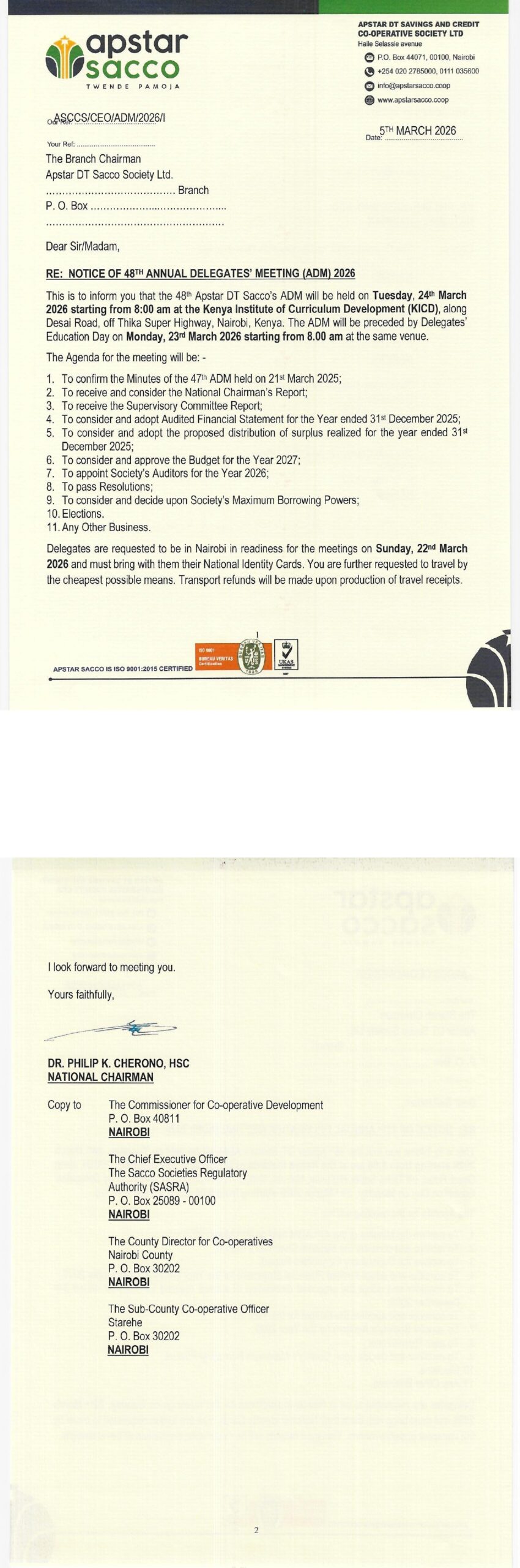 Issued by: Dr. Philip K. Cherono, HSC National Chairman, Apstar DT Sacco Society Ltd.